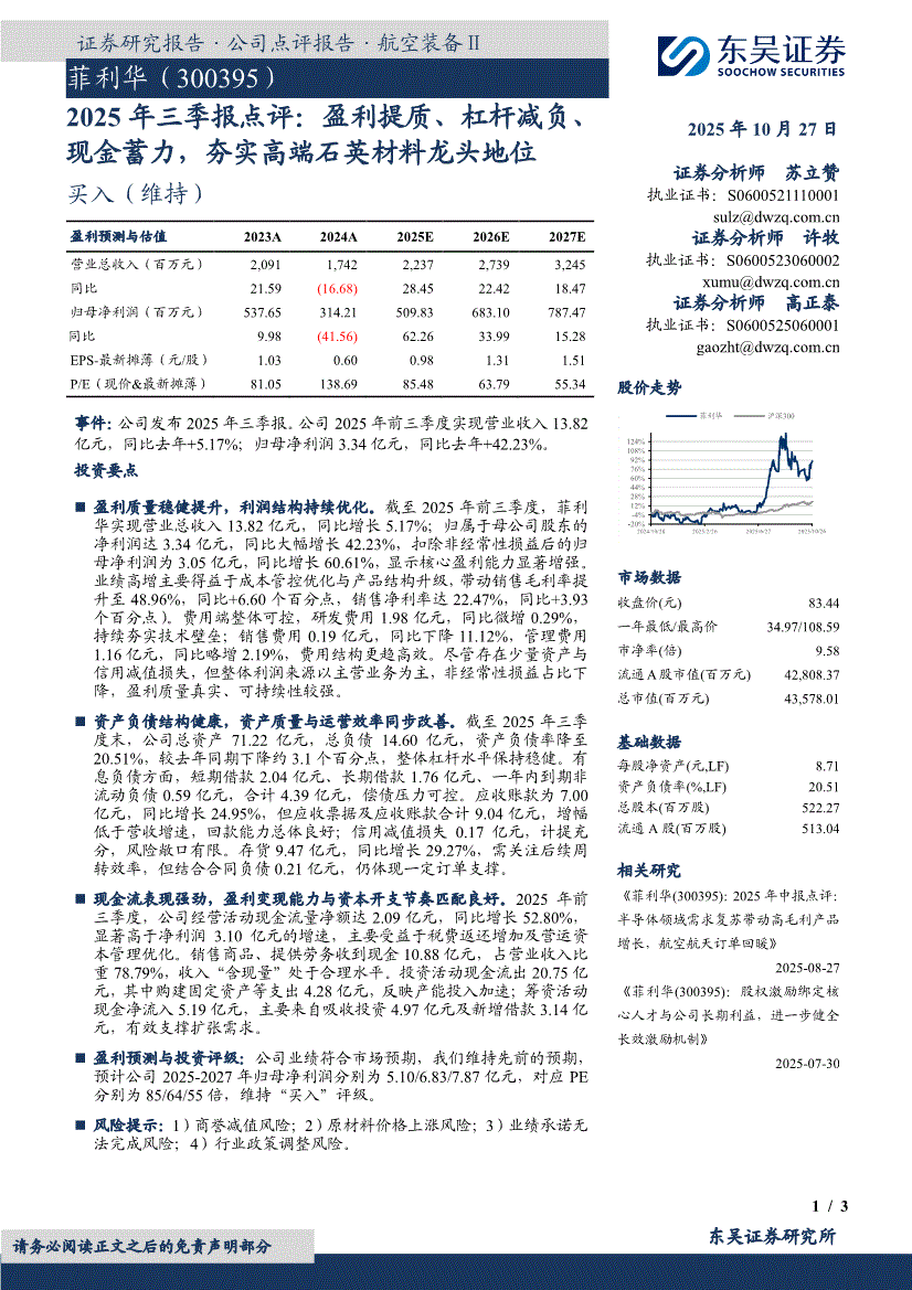 菲利华:东吴证券-菲利华-300395-2025年三季报点评:盈利提质、杠杆减负、现金蓄力,夯实高端石英材料龙头地位-251027