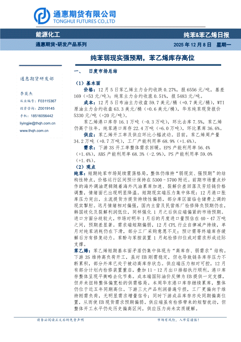 通惠期货-纯苯&苯乙烯日报:纯苯弱现实压制,苯乙烯供应回升-251205