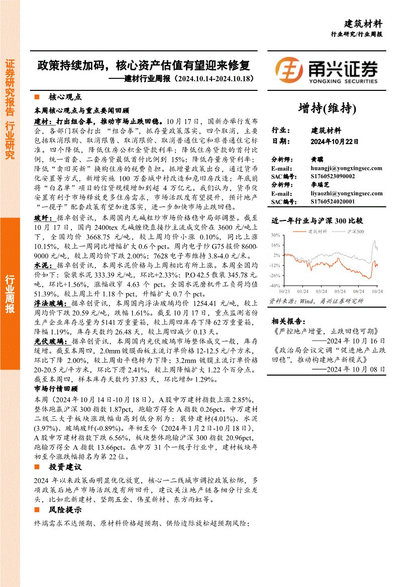 建材行业:甬兴证券-建材行业周报:政策持续加码,核心资产估值有望迎来修复-241022