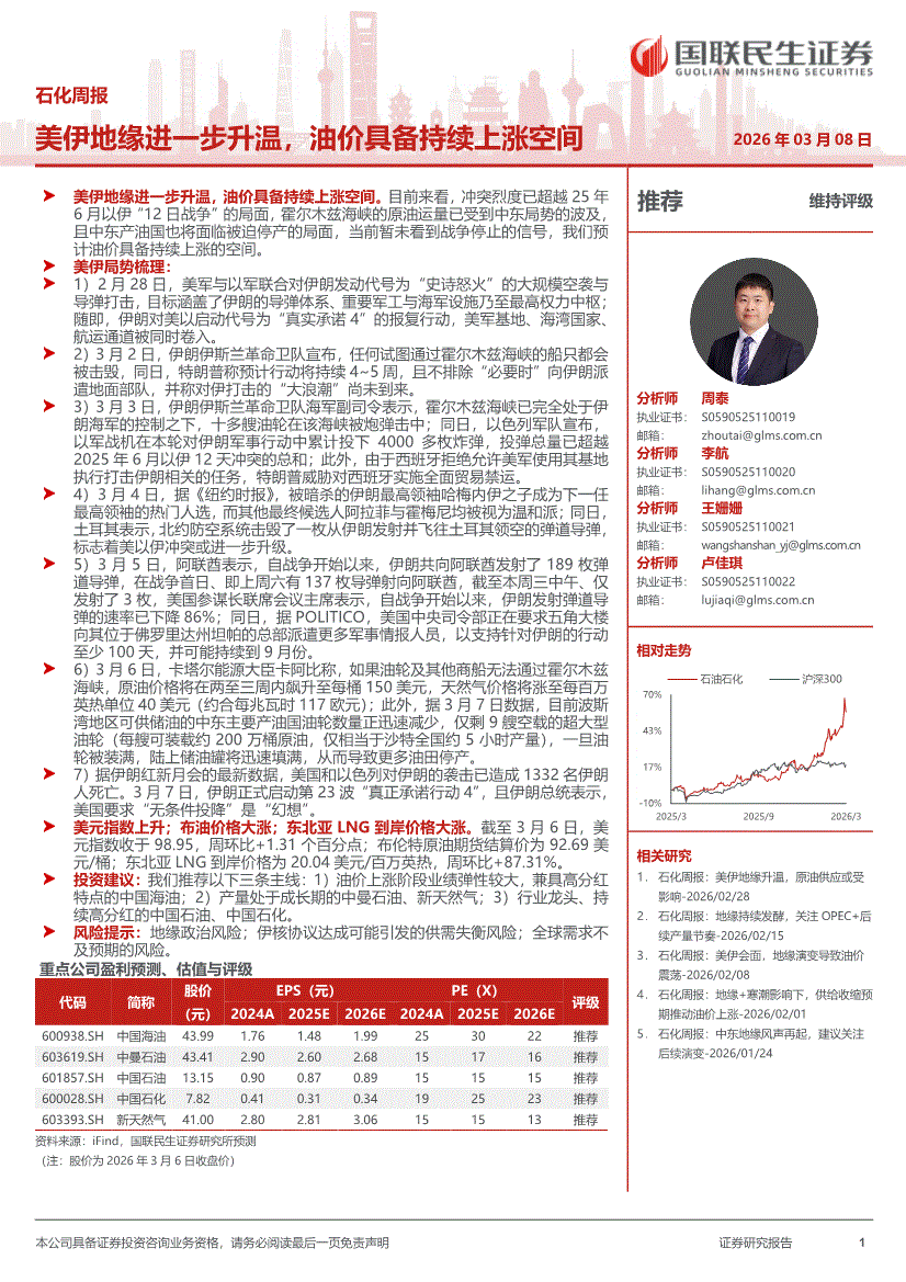 石化行业:国联民生证券-石化行业周报:美伊地缘进一步升温,油价具备持续上涨空间-260308