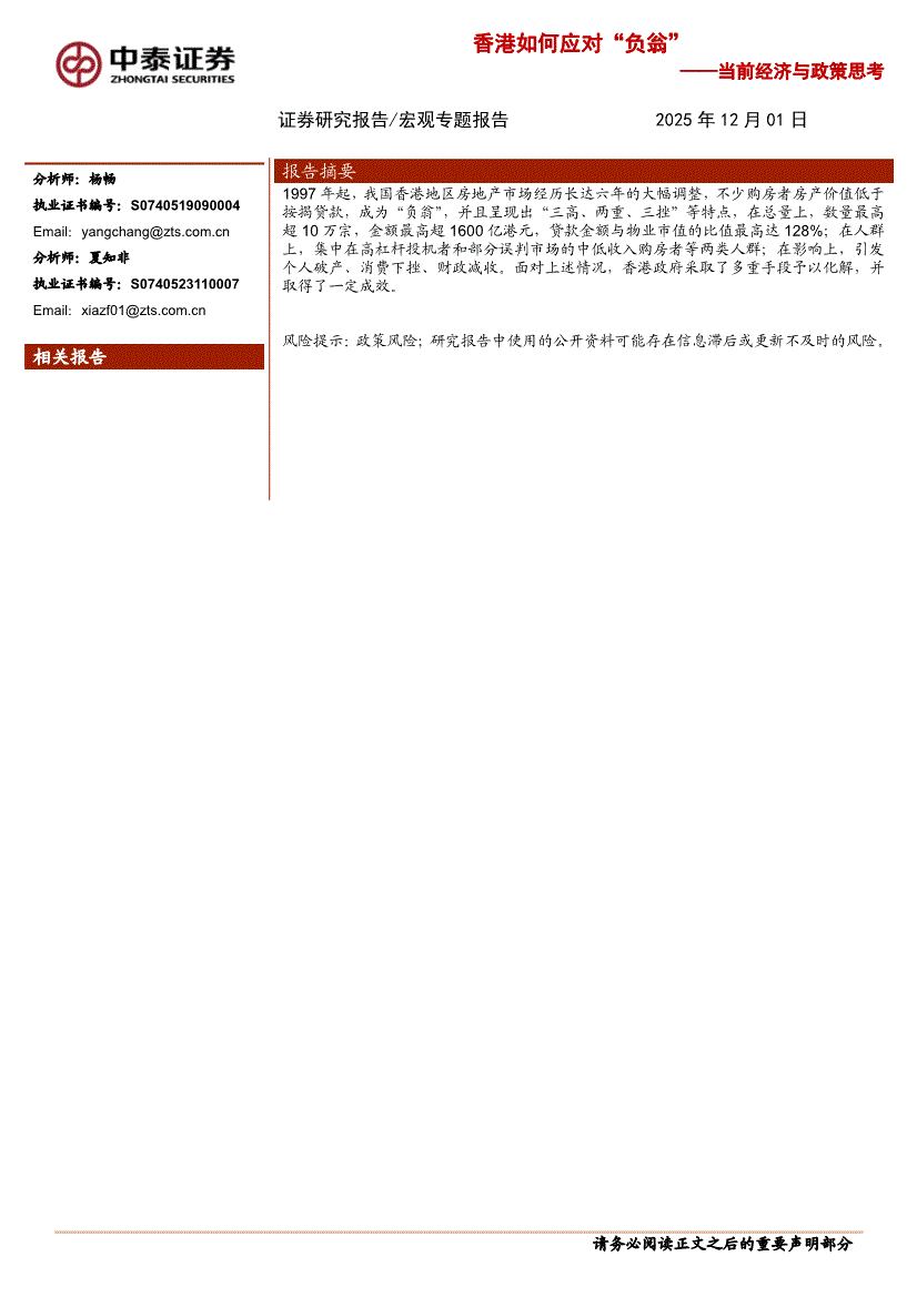 中泰证券-当前经济与政策思考:香港如何应对“负翁”-251201