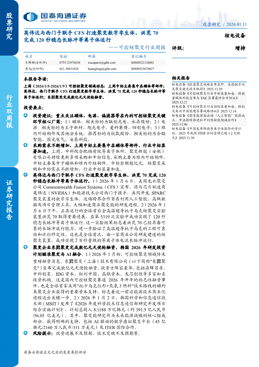 可控核聚变行业:国泰海通证券-可控核聚变行业周报:英伟达与西门子联手CFS打造聚变数字孪生体,洪荒70完成120秒稳态长脉冲等离子体运行-260111