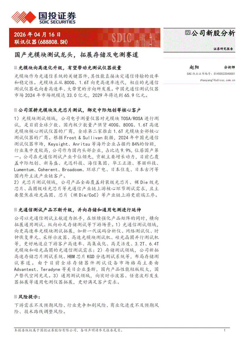 联讯仪器:国投证券-联讯仪器-688808-国产光模块测试龙头,拓展存储及电测赛道-260416