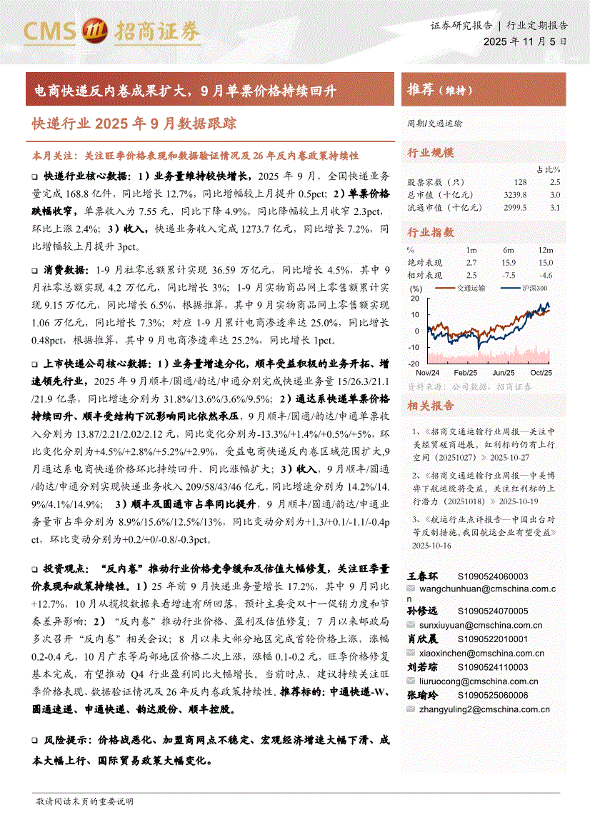 快递行业:招商证券-快递行业2025年9月数据跟踪:电商快递反内卷成果扩大,9月单票价格持续回升-251105