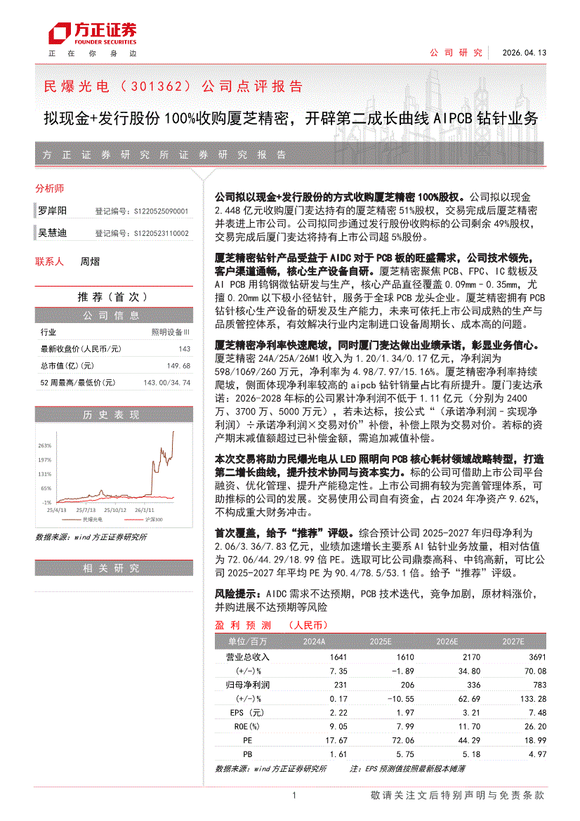 民爆光电:方正证券-民爆光电-301362-公司点评报告:拟现金+发行股份100%收购厦芝精密,开辟第二成长曲线AIPCB钻针业务-260413