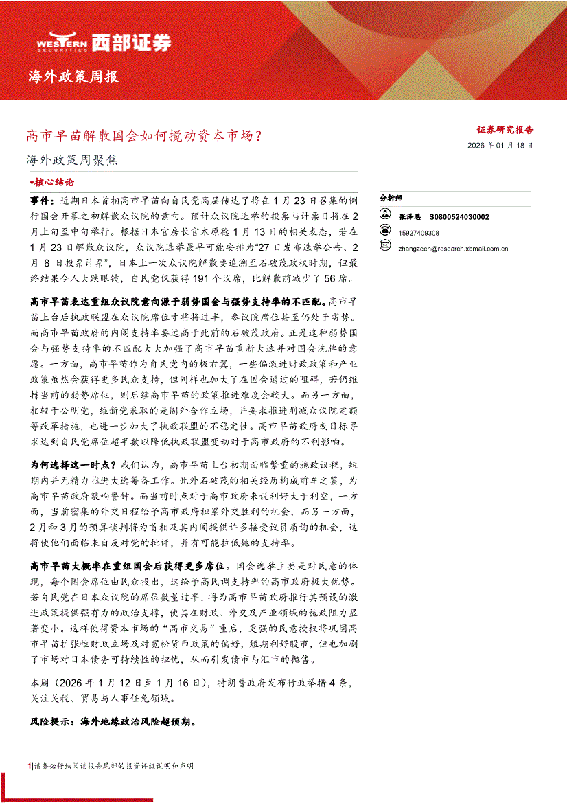 西部证券-海外政策周聚焦:高市早苗解散国会如何搅动资本市场?-260118