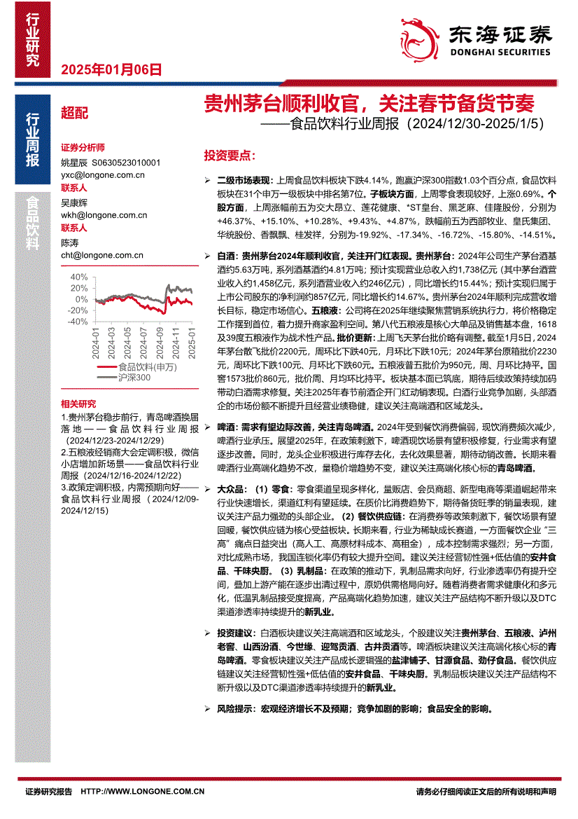 食品饮料行业:东海证券-食品饮料行业周报:贵州茅台顺利收官,关注春节备货节奏-250106