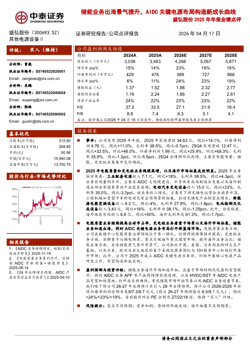 盛弘股份:中泰证券-盛弘股份-300693-2025年年报业绩点评:储能业务出海景气提升,AIDC关键电源布局构造新成长曲线-260417