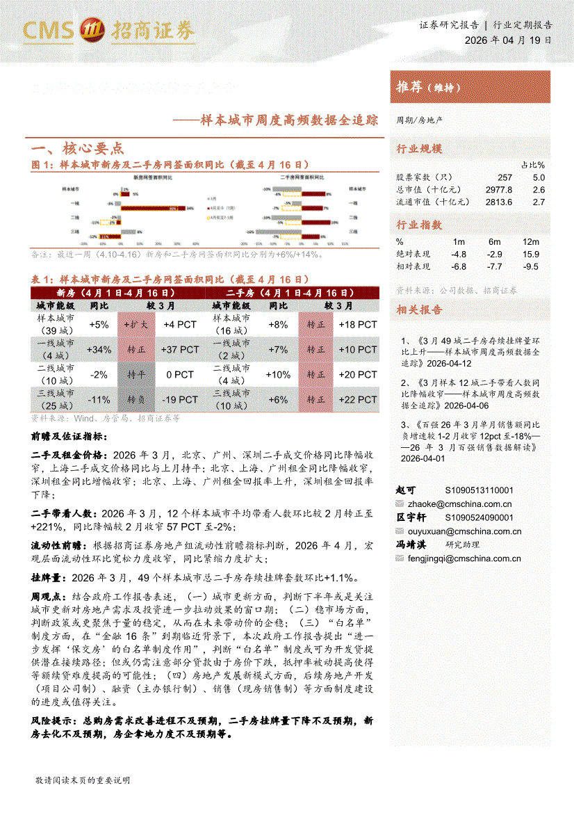 房地产行业:招商证券-房地产行业样本城市周度高频数据全追踪:3月推盘未售去化周期较2月上升-260419