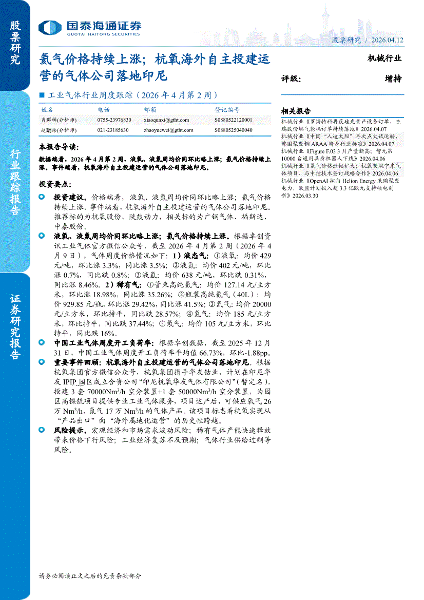 工业气体行业:国泰海通证券-工业气体行业周度跟踪(2026年4月第2周):氦气价格持续上涨;杭氧海外自主投建运营的气体公司落地印尼-260412