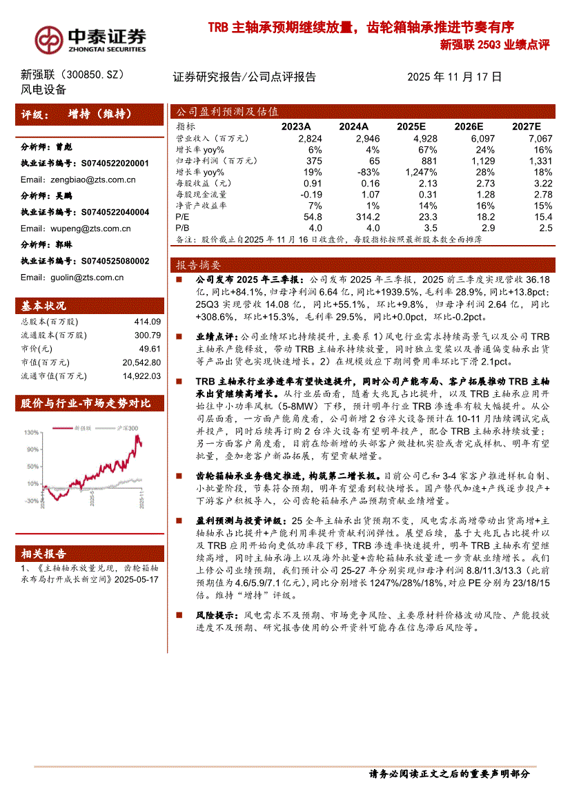 新强联:中泰证券-新强联-300850-25Q3业绩点评:TRB主轴承预期继续放量,齿轮箱轴承推进节奏有序-251117