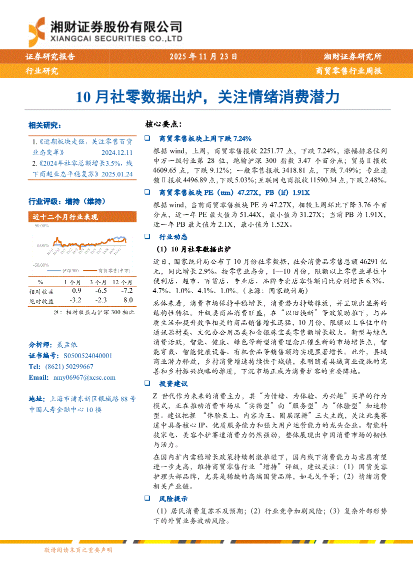 商贸零售行业:湘财证券-商贸零售行业周报:10月社零数据出炉,关注情绪消费潜力-251123