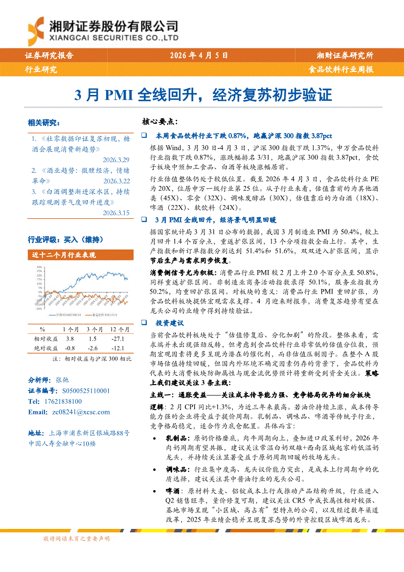 湘财证券-食品饮料行业周报:3月PMI全线回升,经济复苏初步验证-260405