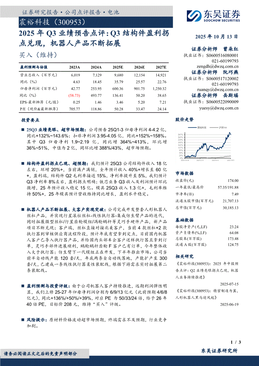 震裕科技:东吴证券-震裕科技-300953-2025年Q3业绩预告点评:Q3结构件盈利拐点兑现,机器人产品不断拓展-251013