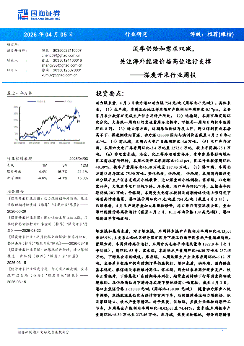 煤炭开采行业:国海证券-煤炭开采行业周报:淡季供给和需求双减,关注海外能源价格高位运行支撑-260405