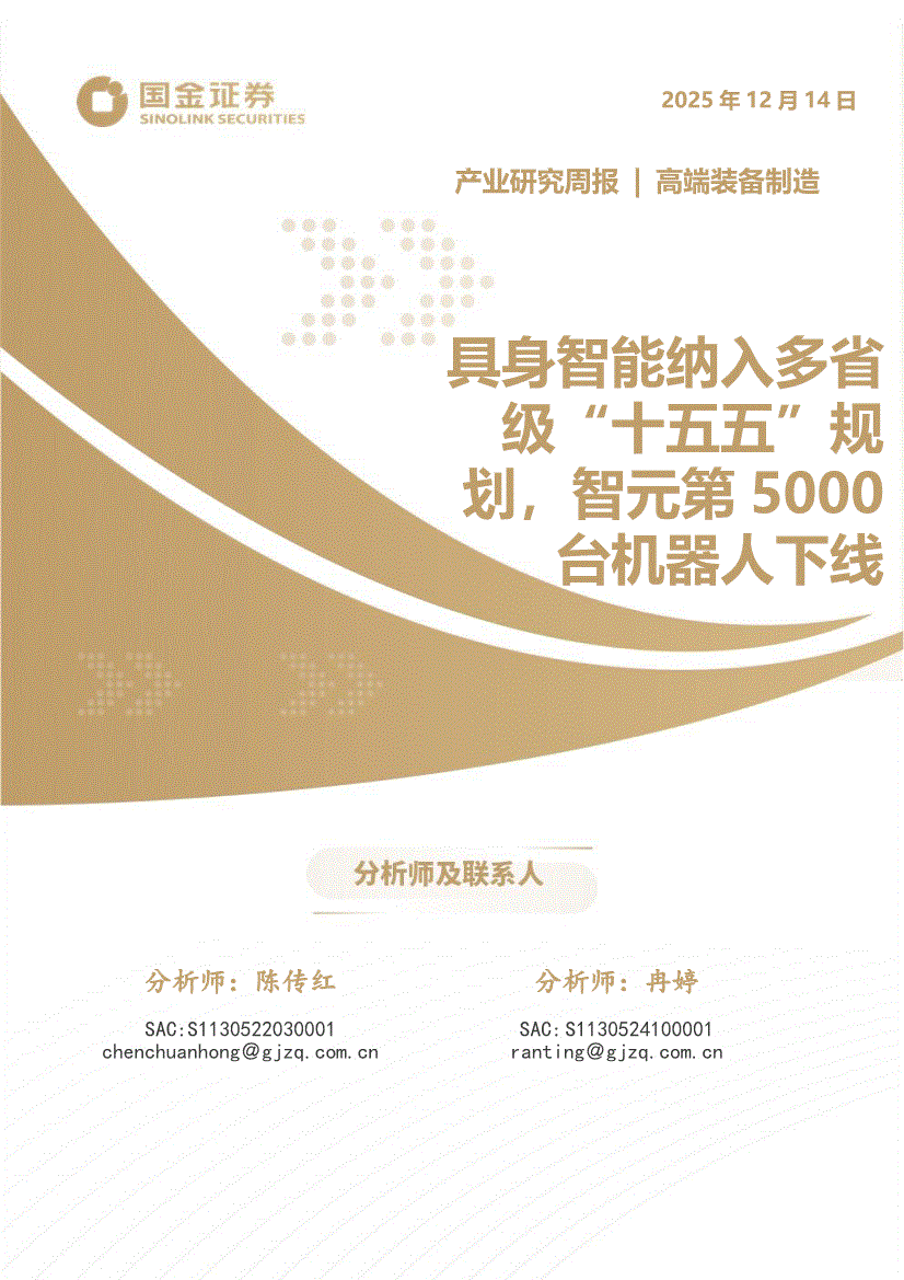 高端装备制造行业:国金证券-高端装备制造行业产业研究周报:具身智能纳入多省级“十五五”规划,智元第5000台机器人下线-251214