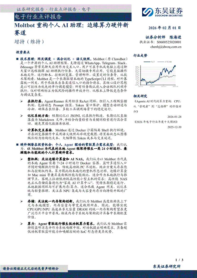 东吴证券-电子行业点评报告:Moltbot重构个人AI助理,边缘算力硬件新赛道-260201