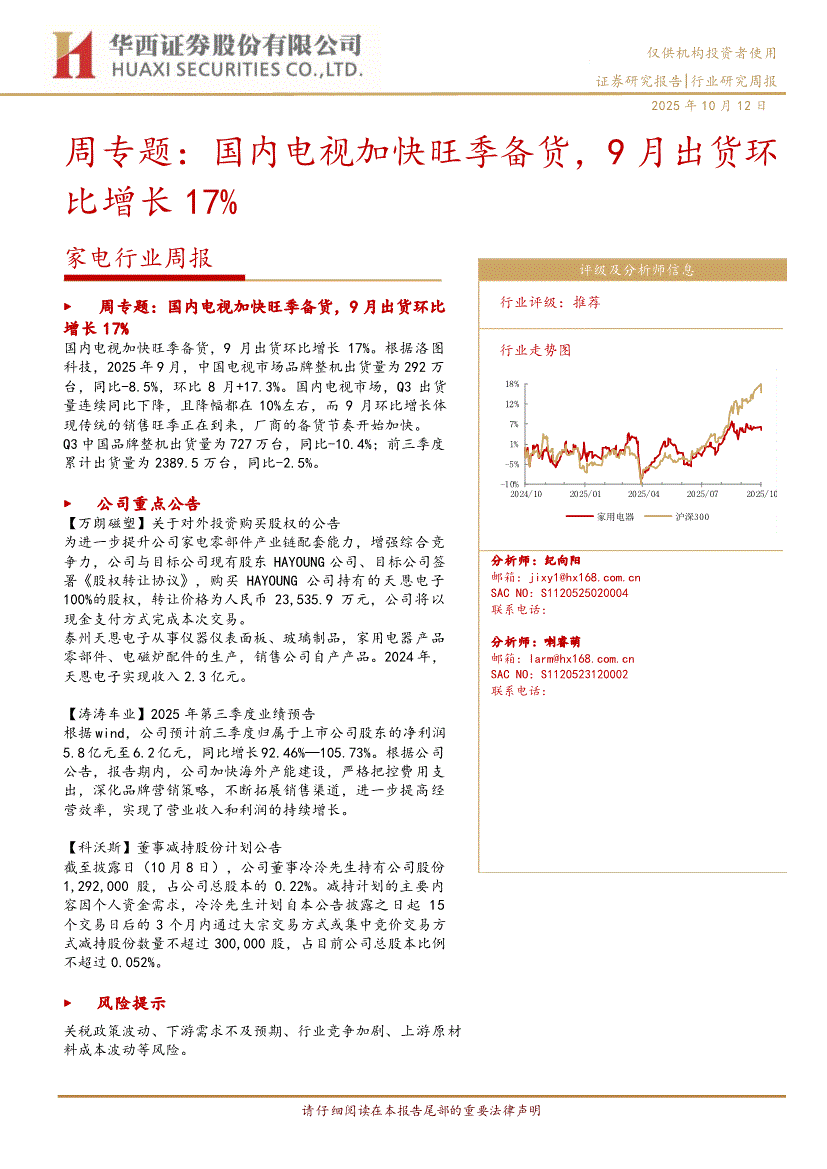 家电行业:华西证券-家电行业周专题:国内电视加快旺季备货,9月出货环比增长17%-251012