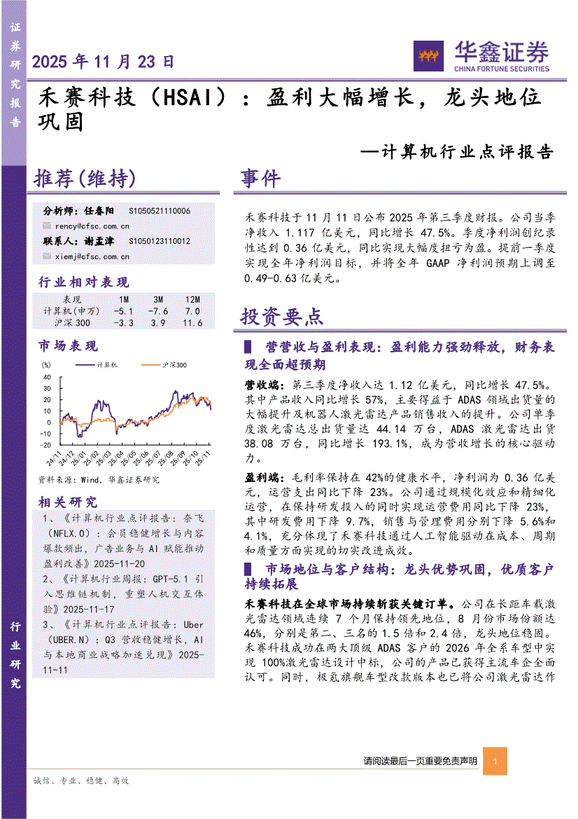 计算机行业:华鑫证券-计算机行业点评报告:禾赛科技(HSAI),盈利大幅增长,龙头地位巩固-251123