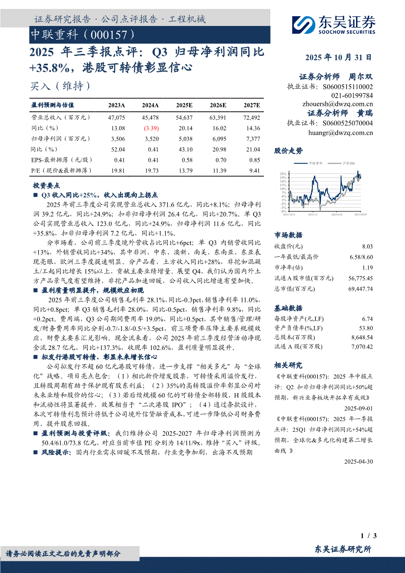 中联重科:东吴证券-中联重科-000157-2025年三季报点评:Q3归母净利润同比+35.8%,港股可转债彰显信心-251031