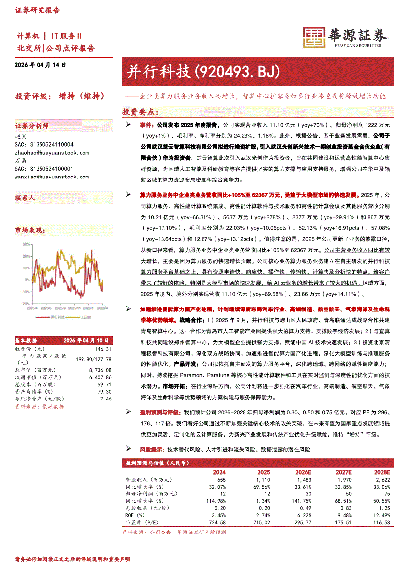并行科技:华源证券-并行科技-920493-企业类算力服务业务收入高增长,智算中心扩容叠加多行业渗透或将释放增长动能-260414