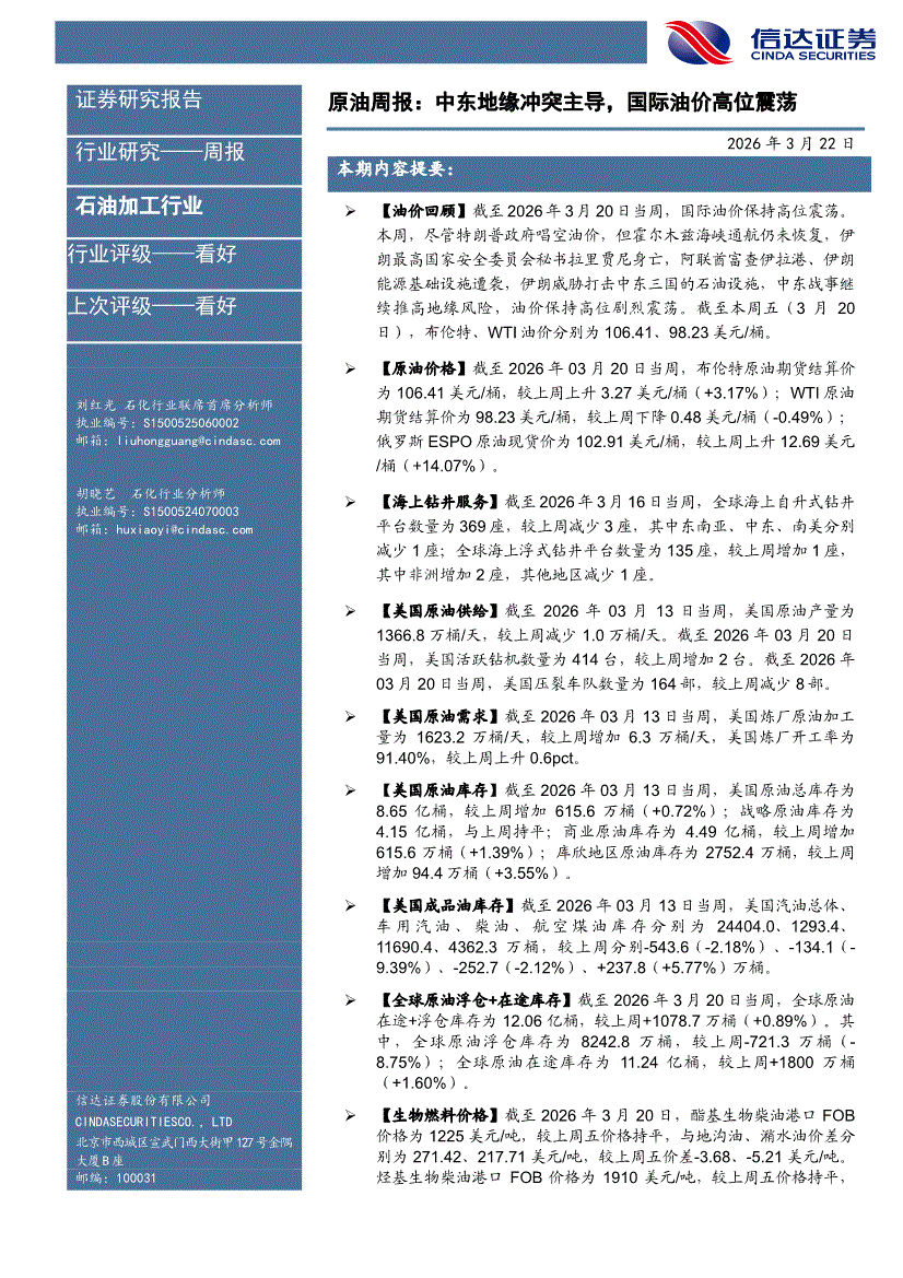 石油加工行业:信达证券-石油加工行业原油周报:中东地缘冲突主导,国际油价高位震荡-260322