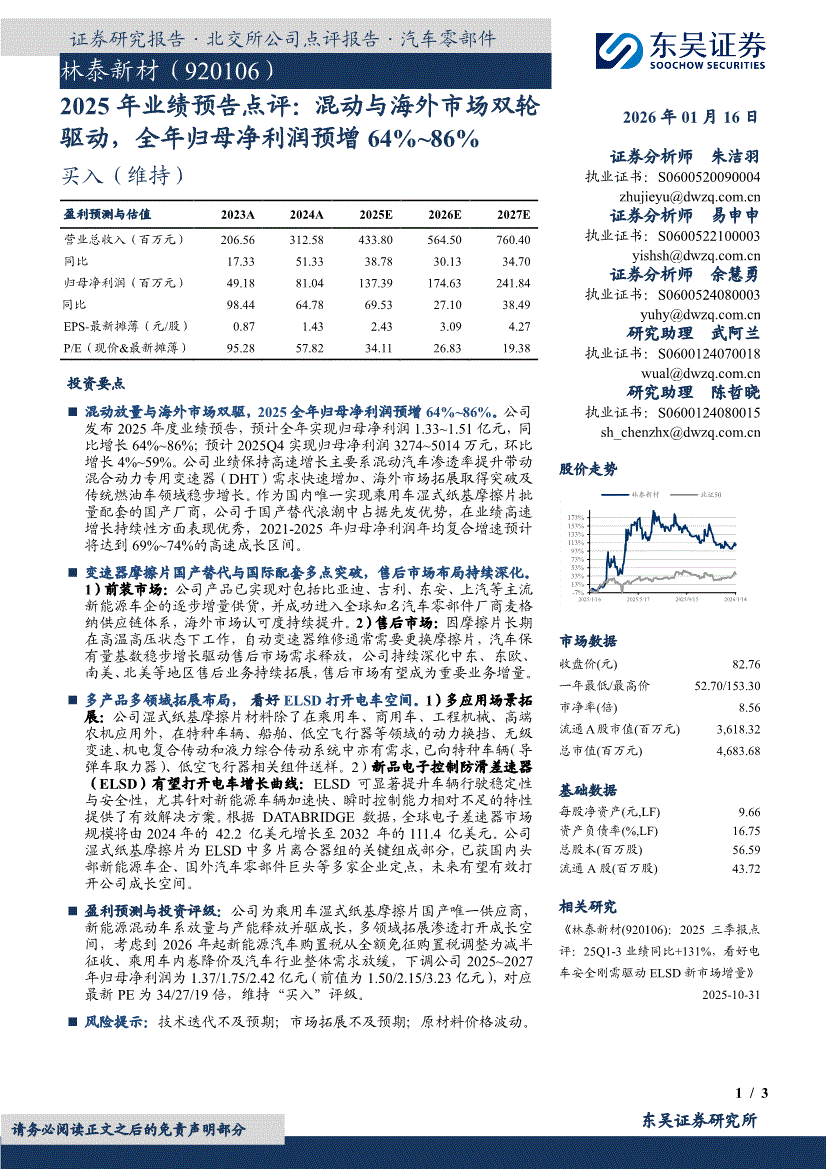 林泰新材:东吴证券-林泰新材-920106-2025年业绩预告点评:混动与海外市场双轮驱动,全年归母净利润预增64%~86%-260116