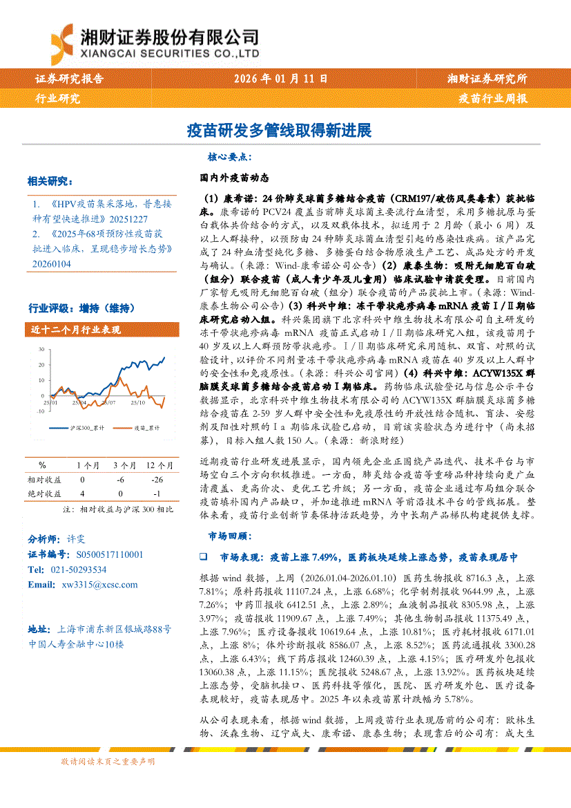 疫苗行业:湘财证券-疫苗行业周报:疫苗研发多管线取得新进展-260111