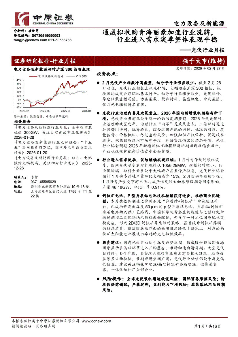 光伏行业:中原证券-光伏行业月报:通威拟收购青海丽豪加速行业洗牌,行业进入需求淡季整体表现平稳-260227