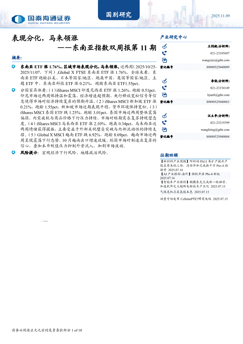 国泰海通证券-国别研究:东南亚指数双周报第11期,表现分化,马来领涨-251109