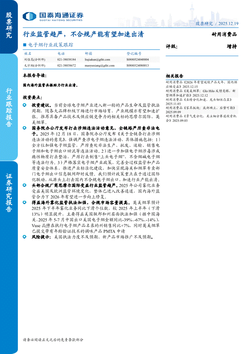 电子烟行业:国泰海通证券-电子烟行业政策跟踪:行业监管趋严,不合规产能有望加速出清-251219