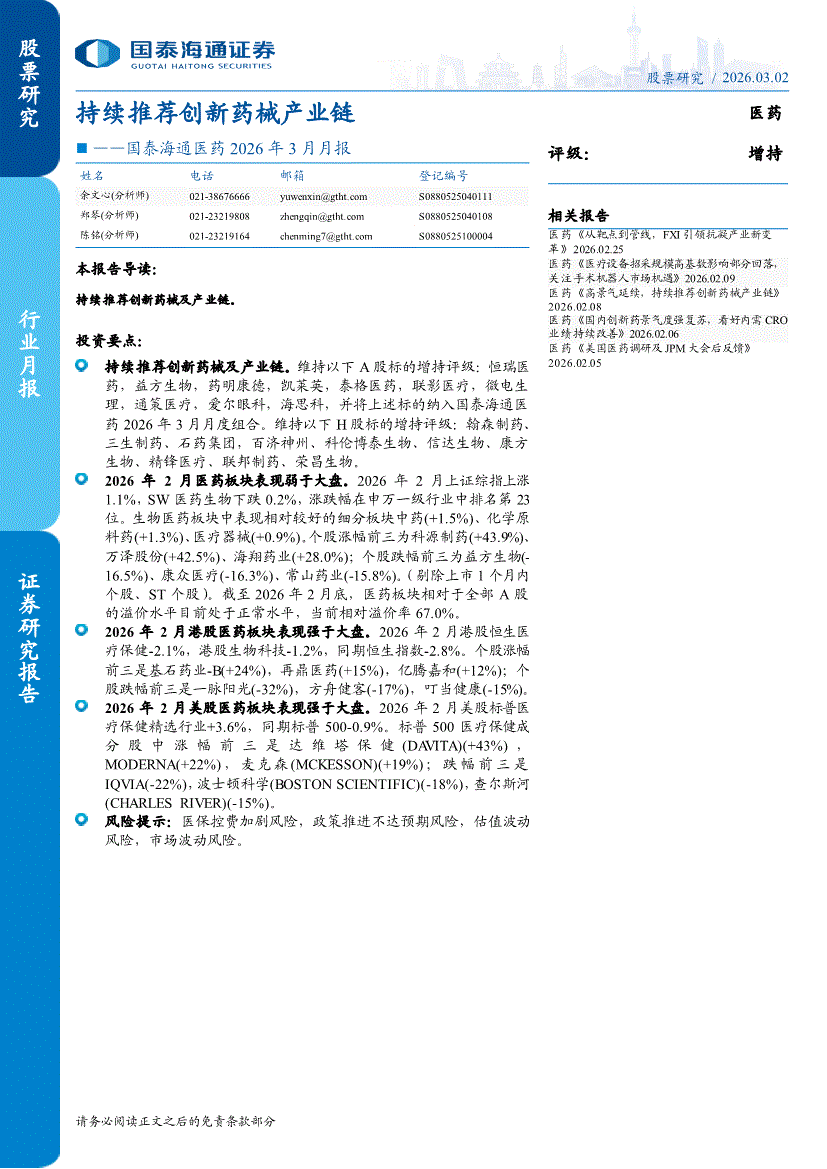 医药行业:国泰海通证券-医药行业2026年3月月报:持续推荐创新药械产业链-260302