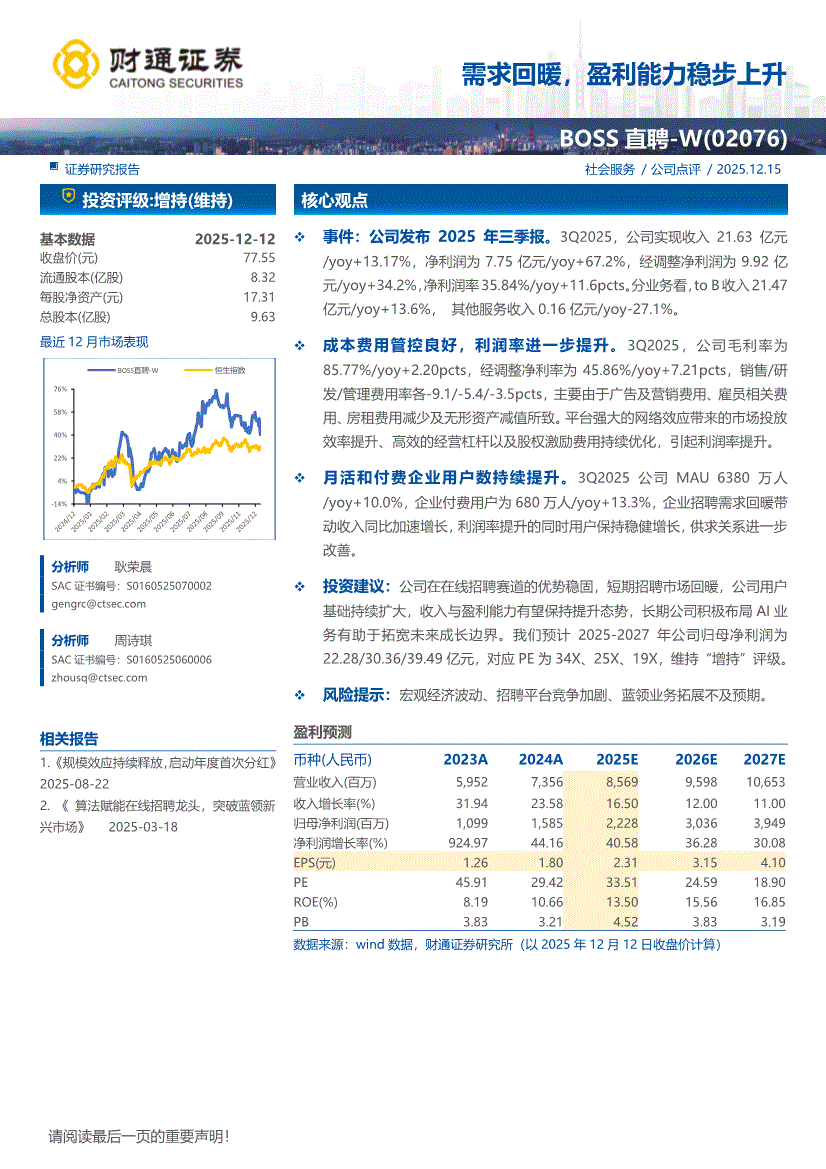 BOSS直聘~W:财通证券-BOSS直聘~W-2076.HK-需求回暖,盈利能力稳步上升-251215