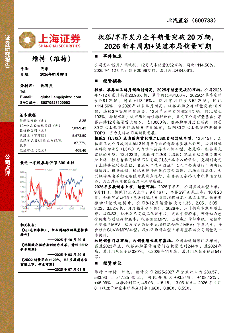 北汽蓝谷:上海证券-北汽蓝谷-600733-极狐/享界发力全年销量突破20万辆,2026新车周期+渠道布局销量可期-260109