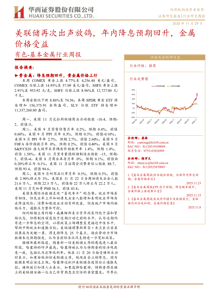有色-基本金属行业:华西证券-有色~基本金属行业周报:美联储再次出声放鸽,年内降息预期回升,金属价格受益-251129