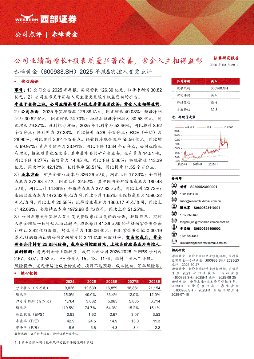 赤峰黄金:西部证券-赤峰黄金-600988-2025年报&实控人变更点评:公司业绩高增长+报表质量显著改善,紫金入主相得益彰-260328