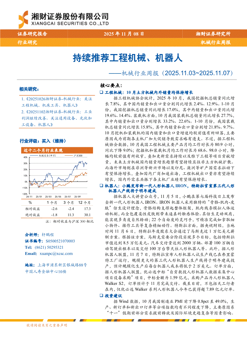 机械行业:湘财证券-机械行业周报:持续推荐工程机械、机器人-251108