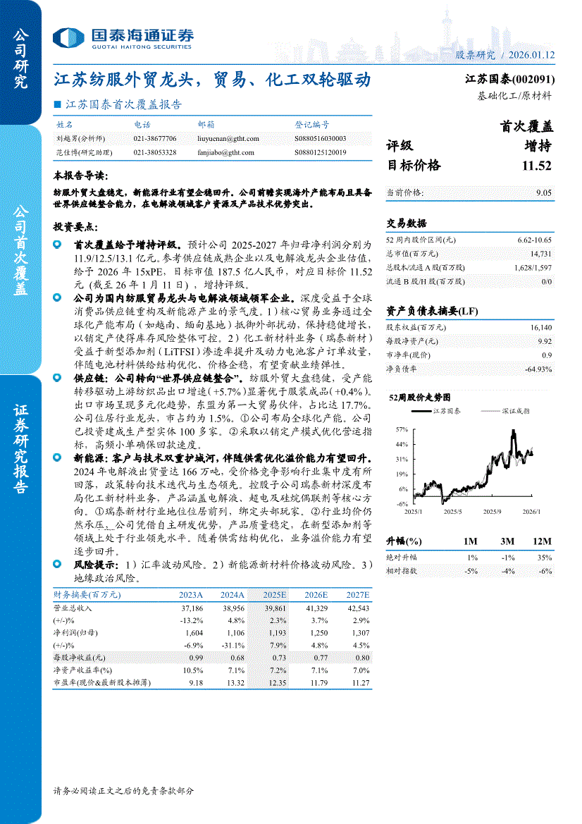 江苏国泰:国泰海通证券-江苏国泰-002091-首次覆盖报告:江苏纺服外贸龙头,贸易、化工双轮驱动-260112