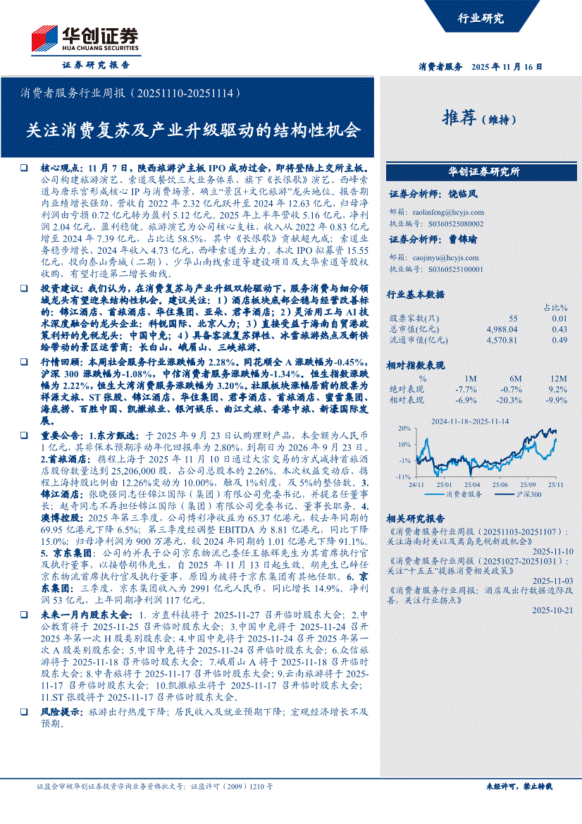 消费者服务行业:华创证券-消费者服务行业周报:关注消费复苏及产业升级驱动的结构性机会-251116