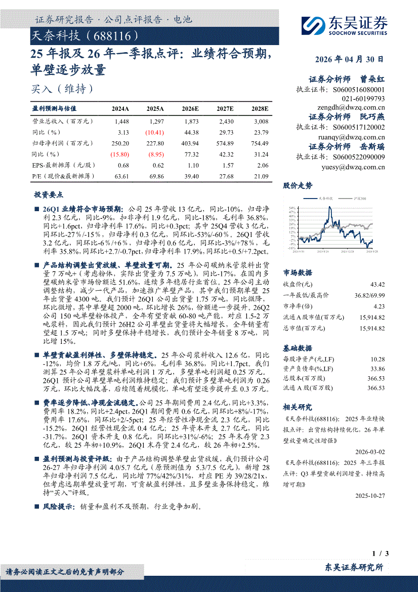 天奈科技:东吴证券-天奈科技-688116-25年报及26年一季报点评:业绩符合预期,单壁逐步放量-260430