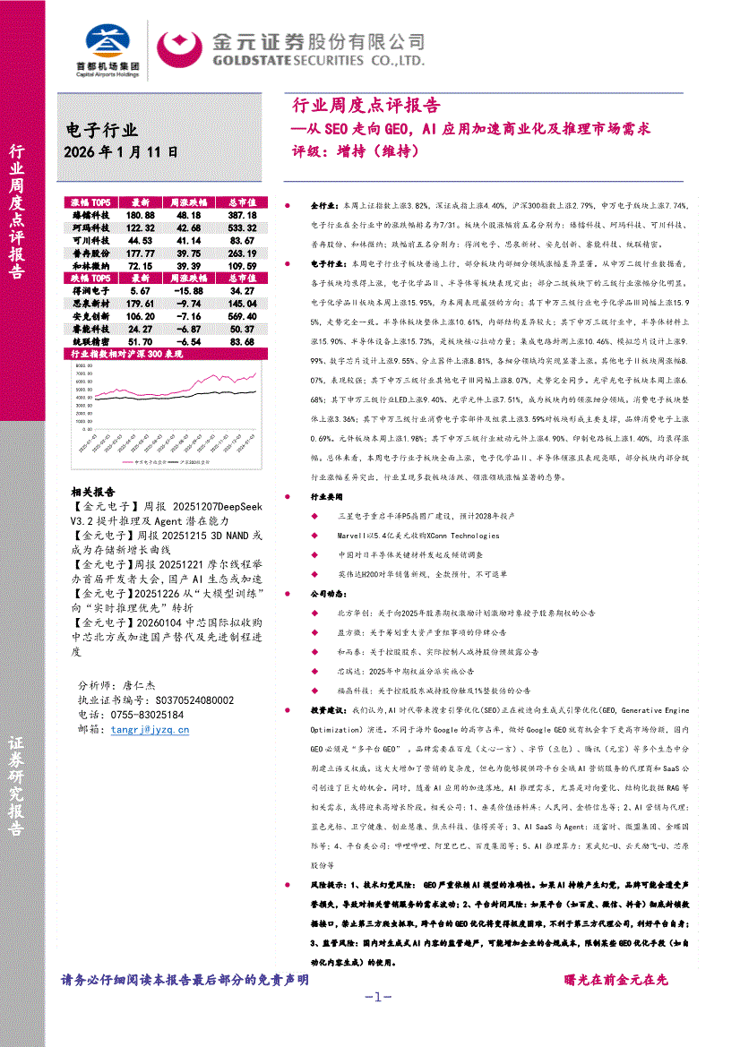 电子行业:金元证券-电子行业周度点评报告:从SEO走向GEO,AI应用加速商业化及推理市场需求-260111