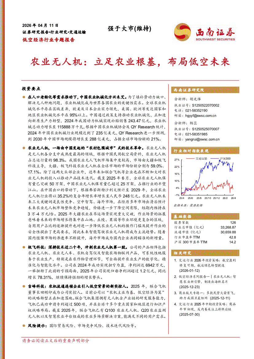低空经济行业:西南证券-低空经济行业专题报告:农业无人机,立足农业根基,布局低空未来-260411