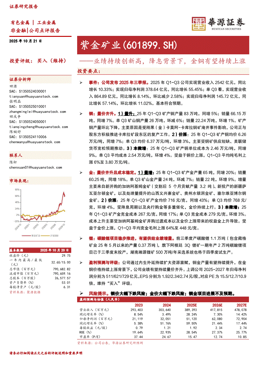 紫金矿业:华源证券-紫金矿业-601899-业绩持续创新高,降息背景下,金铜有望持续上涨-251021
