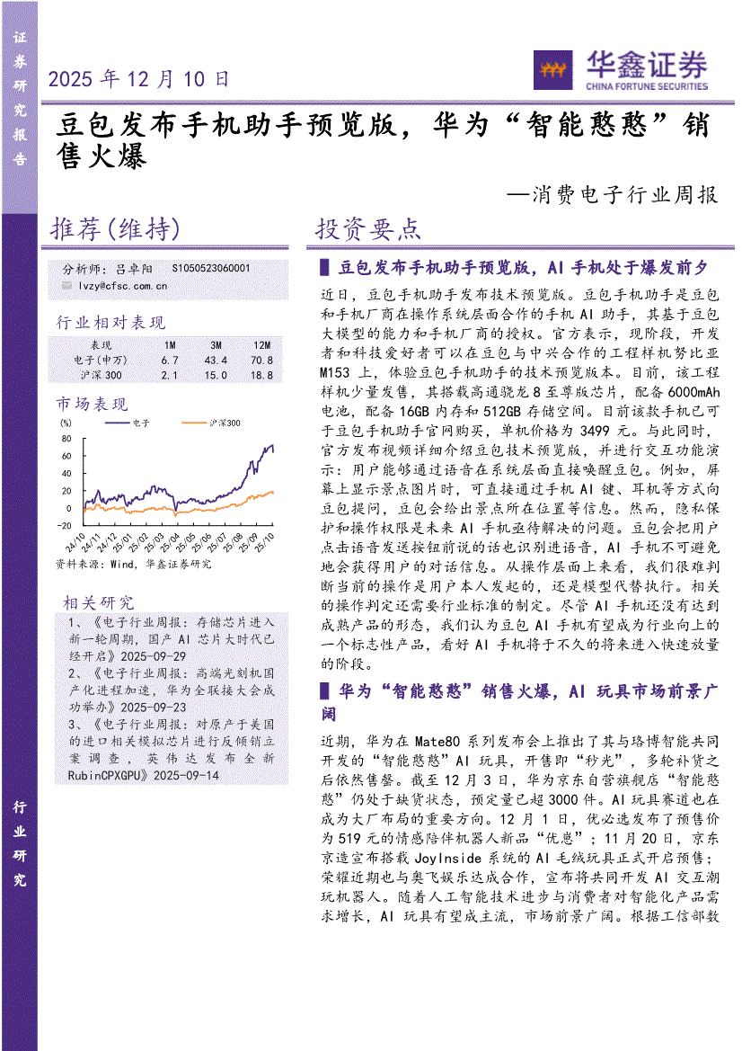 消费电子行业:华鑫证券-消费电子行业周报:豆包发布手机助手预览版,华为“智能憨憨”销售火爆-251210