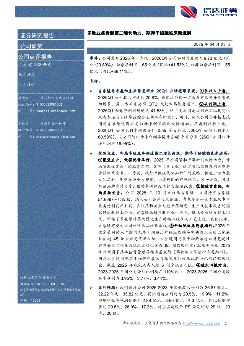 九芝堂:信达证券-九芝堂-000989-多肽业务贡献第二增长动力,期待干细胞临床新进展-260423