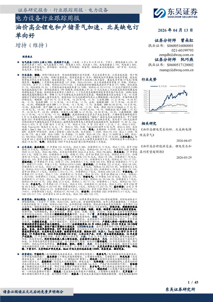 电力设备行业:东吴证券-电力设备行业跟踪周报:油价高企锂电和户储景气加速、北美缺电订单向好-260413