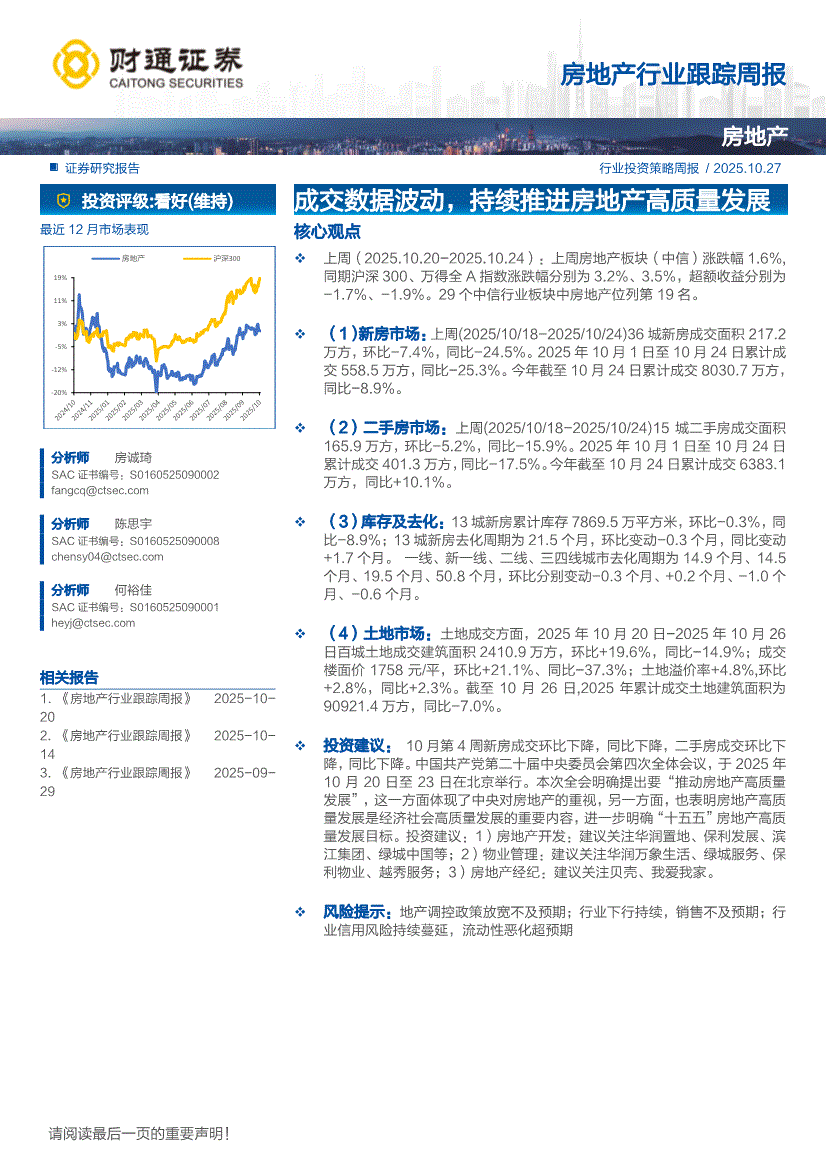 房地产行业:财通证券-房地产行业跟踪周报:成交数据波动,持续推进房地产高质量发展-251027