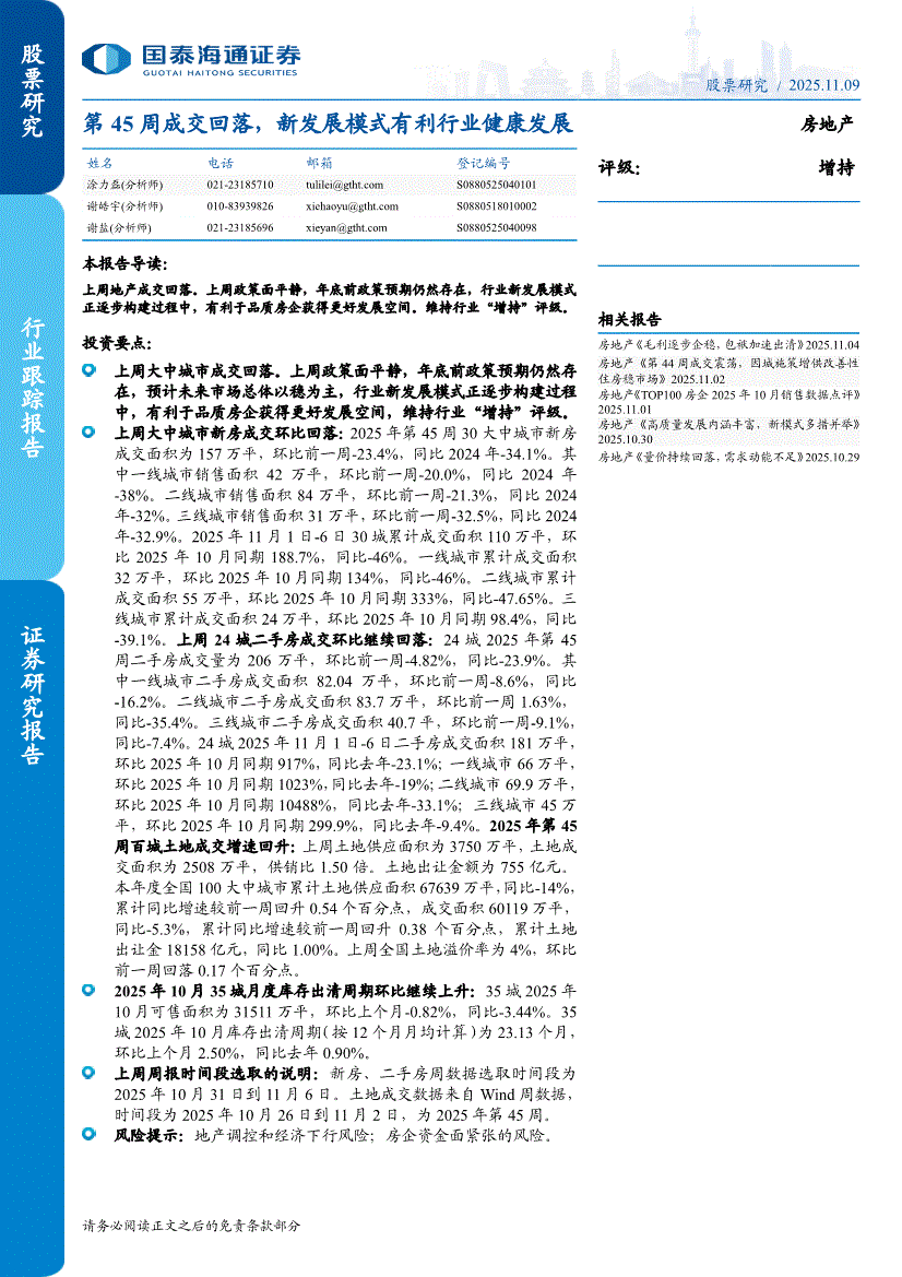 房地产行业:国泰海通证券-房地产行业:第45周成交回落,新发展模式有利行业健康发展-251109