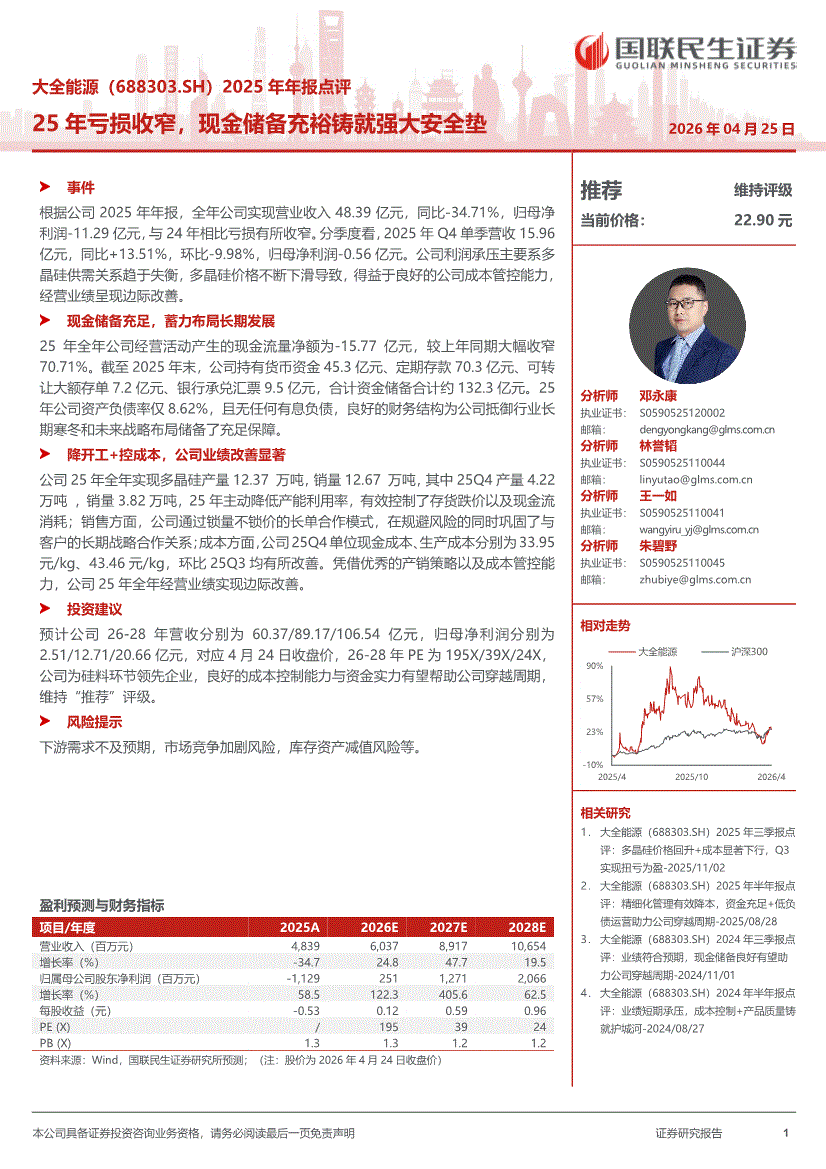 大全能源:国联民生证券-大全能源-688303-2025年年报点评:25年亏损收窄,现金储备充裕铸就强大安全垫-260425