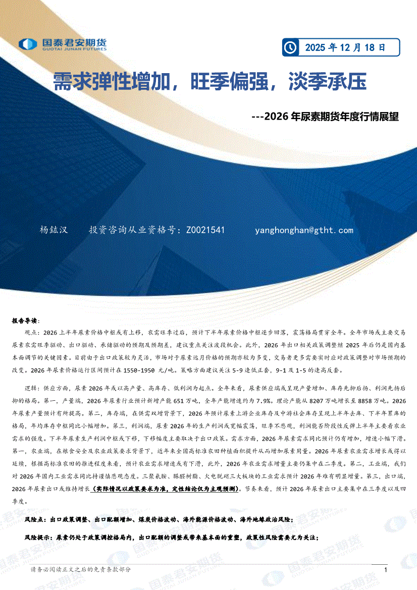 国泰君安期货-2026年尿素期货年度行情展望:需求弹性增加,旺季偏强,淡季承压-251218